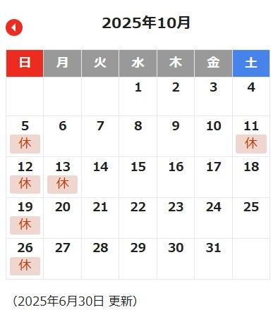 10月の営業カレンダー 2025年9月29日 当店の10月の営業カレンダーをお知らせします。 今月は日曜日以外に10/11~10/13の3日間店舗休業とさせていただきます。 日中はトンボが飛び、朝晩涼しくなってきました。 気温の寒暖差が出てきましたので皆さま体調を崩されませんように 気をつけてください(*^_^*) スタッフ一同