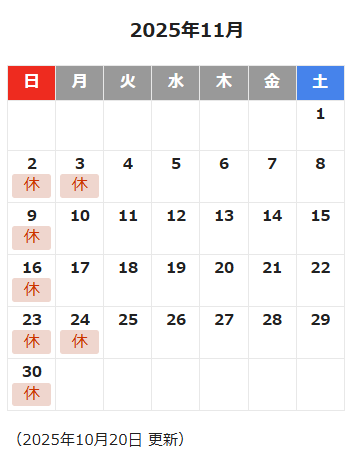 11月の営業カレンダー 2025年10月30日 当店の11月の営業カレンダーをお知らせいたします。 この夏の猛暑で「冬はくるのか!?」等と思っていましたが、 着実に冬はきているようで日中も肌寒くなってきました(>_<) 皆さまのご来店、スタッフ一同お待ちしております。