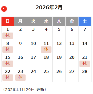 2月は日曜日・祝日以外に21日(土)が店休日となっております。