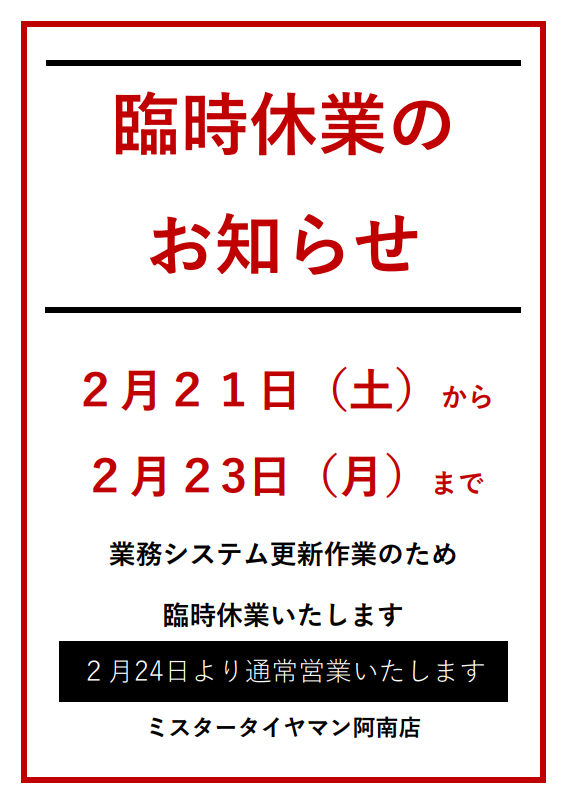 阿南店 2月21日(土)臨時休業のお知らせ 2026年2月19日 いつも当店をご利用いただき、ありがとうございます。 業務システム更新作業のため、21日から23日まで休店日 とさせていただきます。 24日(火)より営業再開いたします。 皆さまには大変ご不便をお掛けいたしますが、 何卒ご理解とご協力を賜りますようお願い申し上げます。 スタッフ一同