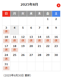 8月の営業カレンダー 2025年8月4日 連日各地で気温40℃超えのニュースの中いかがお過ごしでしょうか。 水分補給、塩分補給、適度な休息で熱中症に気を付けてください(;´・ω・) 当店の8月の営業カレンダーをお知らせいたします。 8月は10日(日)~18日(月)までの9日間休店とさせていただきます。 皆さまのお越しをスタッフ一同お待ちしております。 スタッフ一同