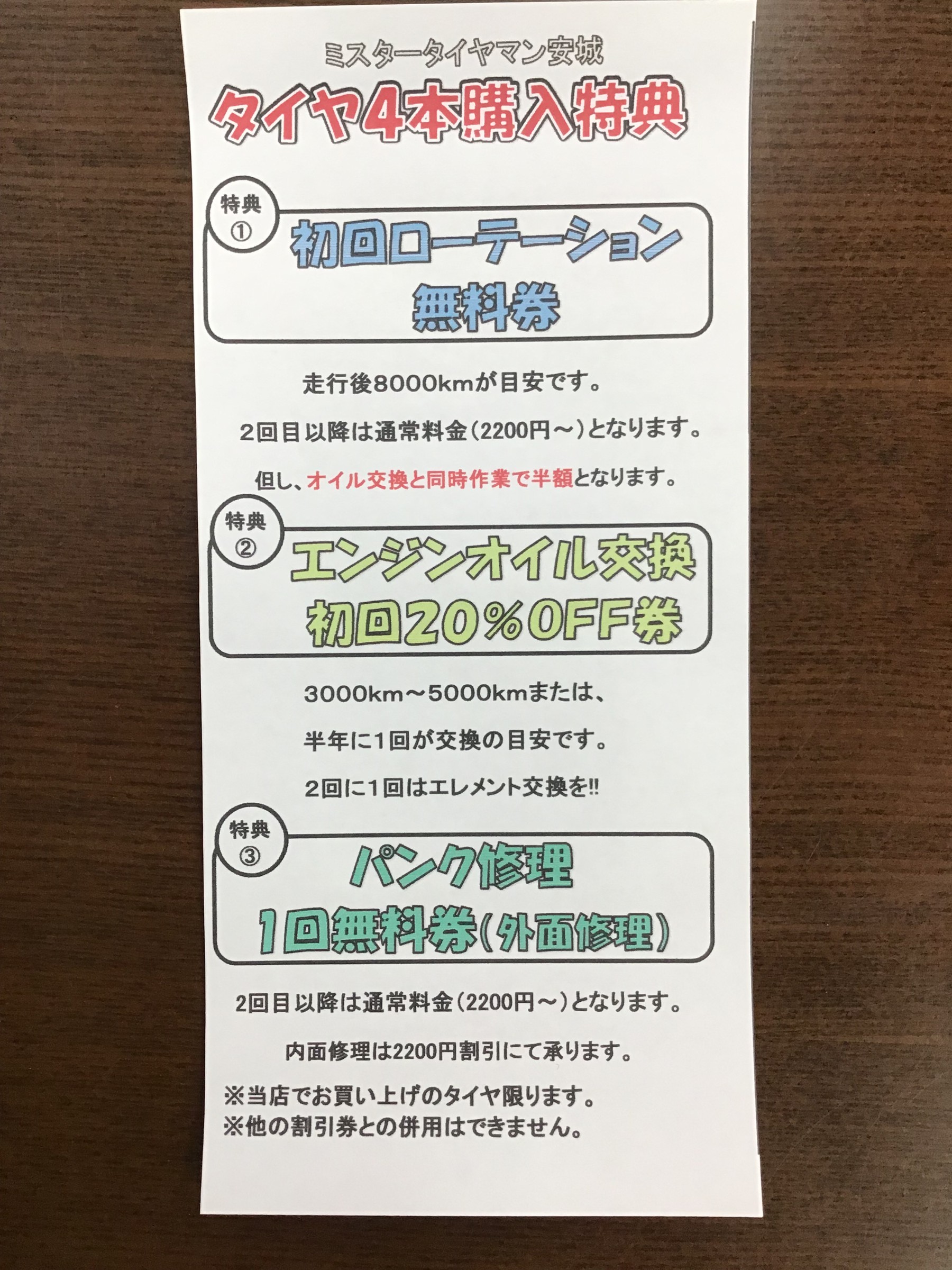 やっています。①タイヤのローテーション(位置交換)を1回無料サービスです。
