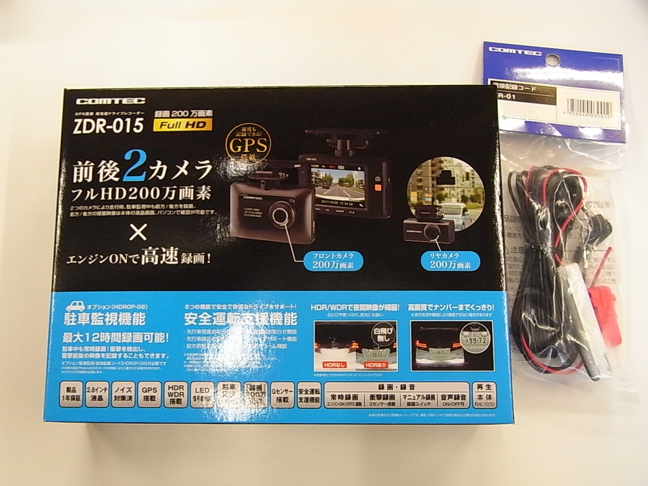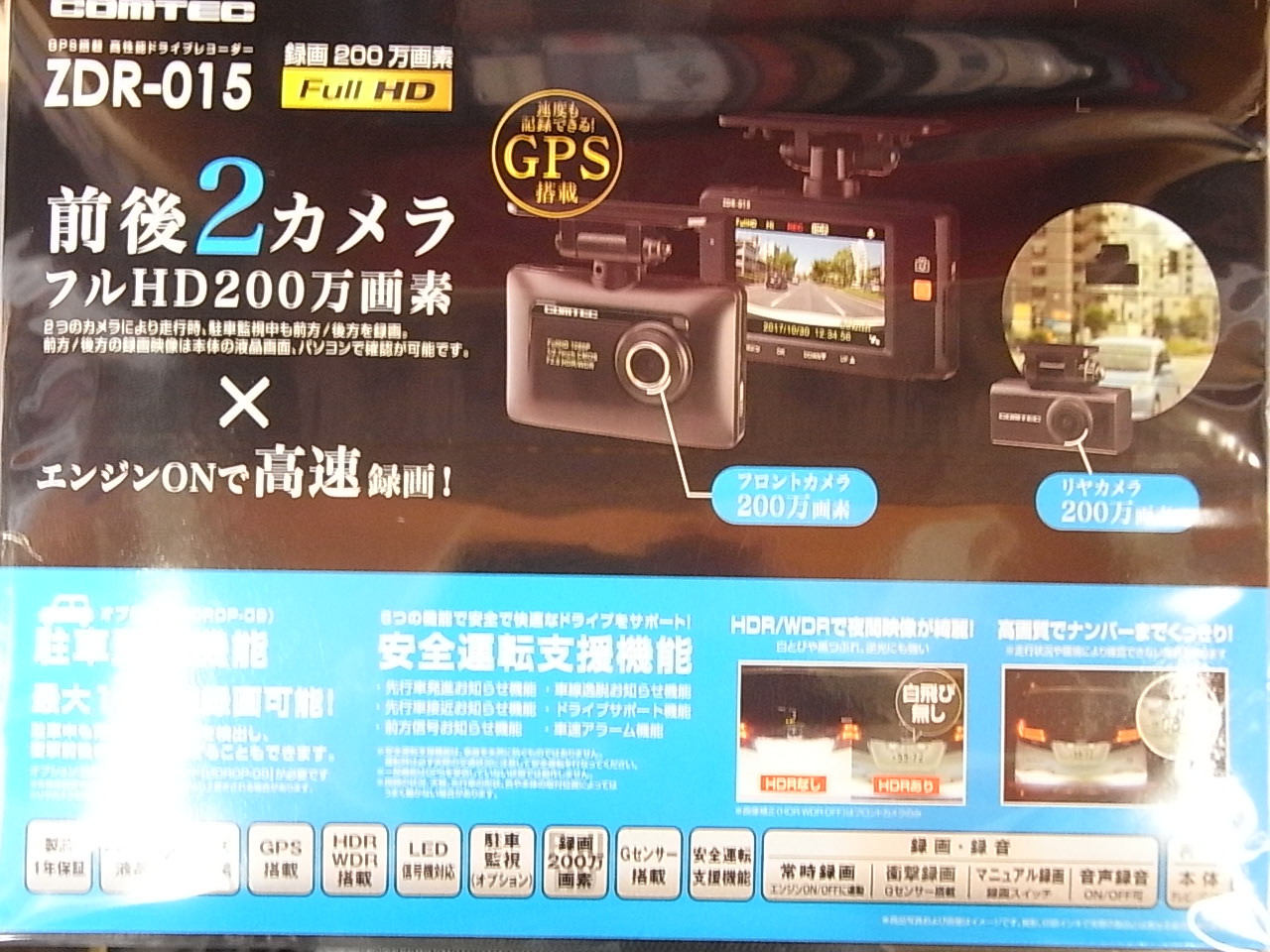 前後の録画ができる、2カメラが売りのコムテック ZDR-015になります。