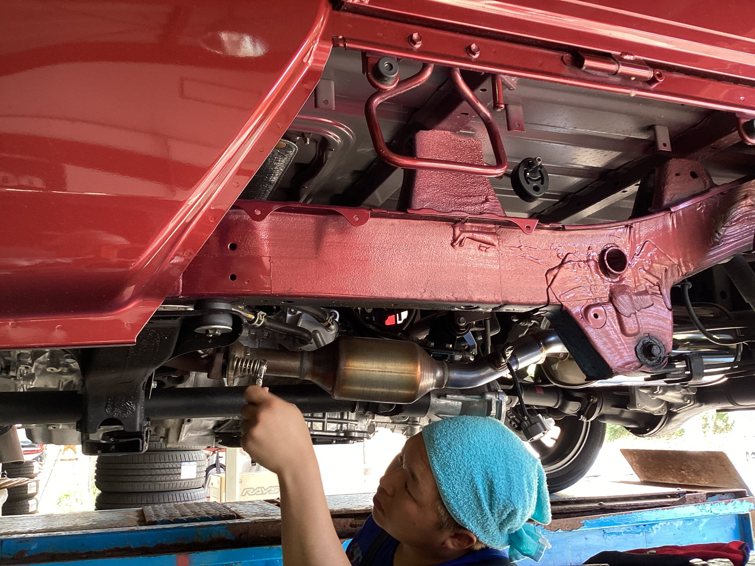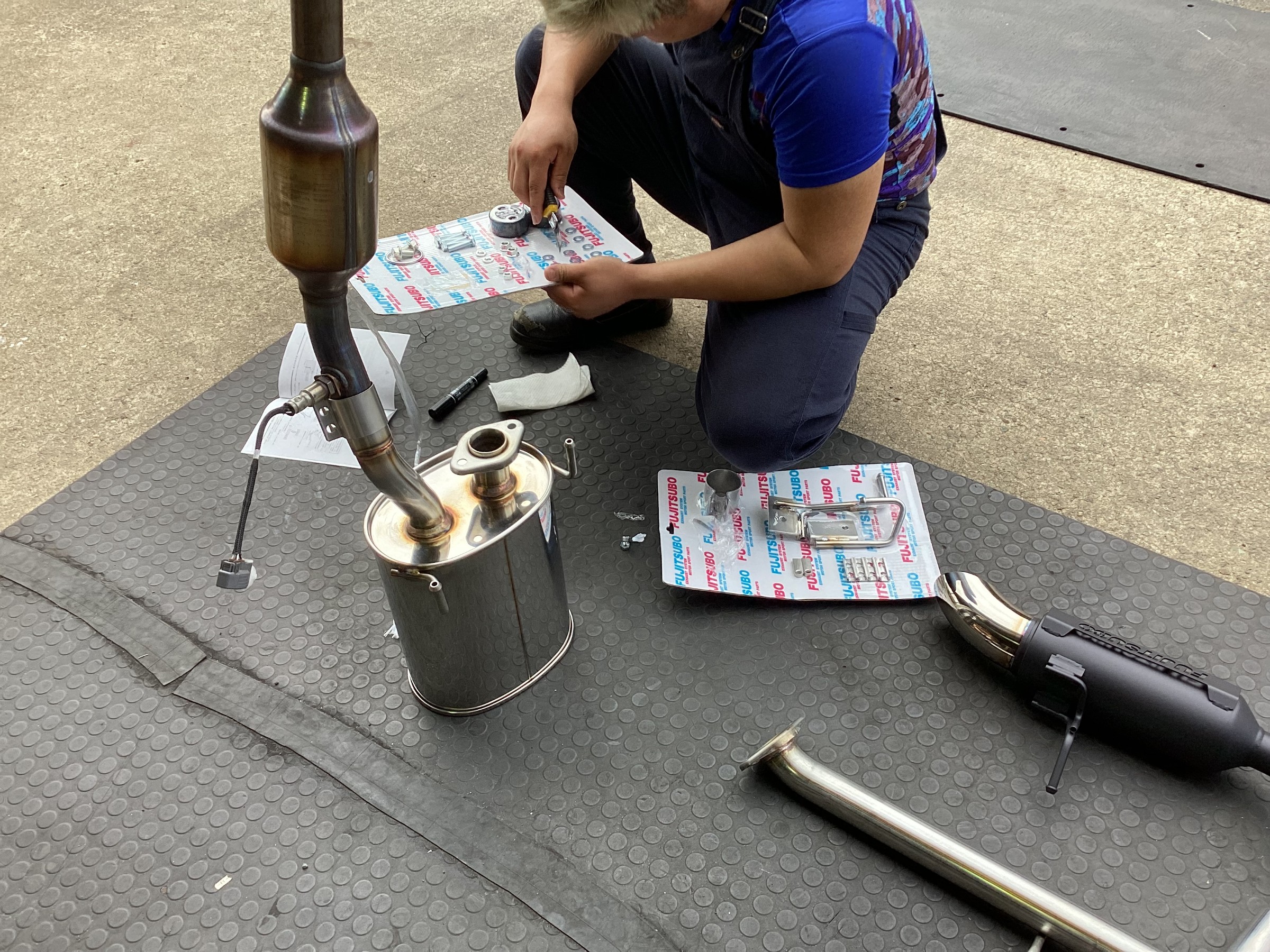 仮止め後、マフラーの出口の角度を調整しながら増し締めし