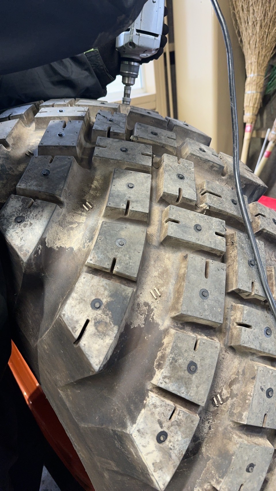 本日はショベルのタイヤをスパイクピン加工しました。