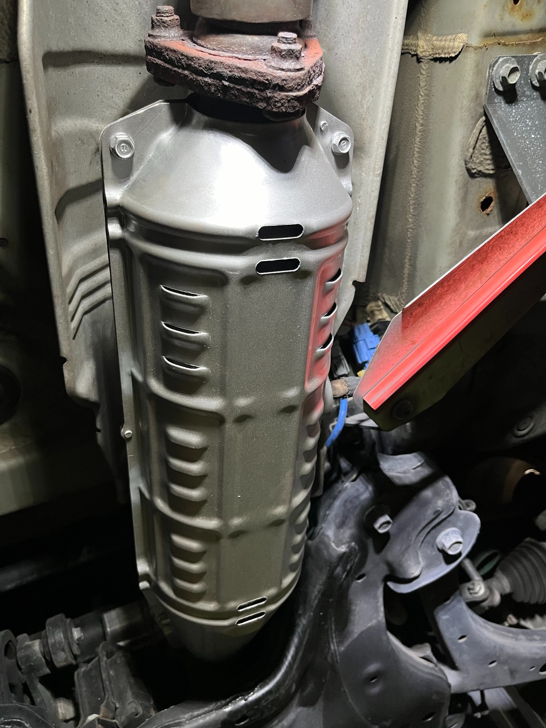 手前側の遮熱板のロワーのネジを止める部分が錆びて、2ヶ所とも無くなってます☹