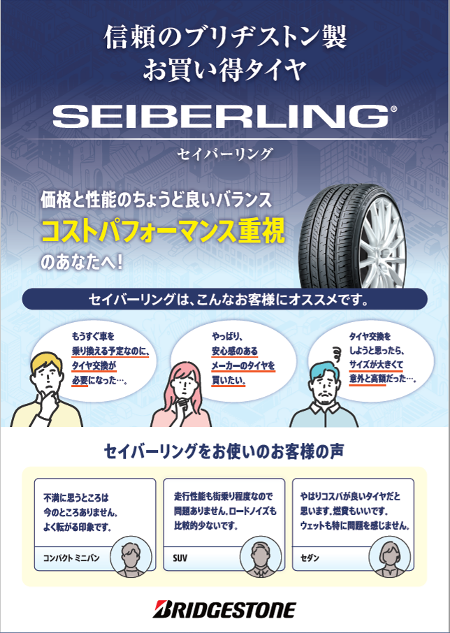 BRIDGESTONEブリヂストン製で安心!!SEIBERLINGセイバーリングの紹介です!! リーズナブルなのに高品質なタイヤの紹介です。 サイズ設定が豊富なので軽カーからセダンまで装着出来ます(*^^)v なぜリーズナブルなのに高品質なのか?? それは・・・BRIDGESTONEブリヂストンの工場で生産されているから...