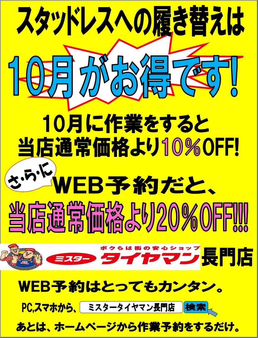 ミスタータイヤマン長門店をご利用いただきありがとうございます。 只今、ハロウィンイベント開催中! 当店をご利用して頂いた方に景品プレゼント! 【お菓子の詰め合わせ&オイル交換10%割引券】 冬の準備にスタッドレスタイヤのお見積り、履き替え交換も受付中! スタッドレスタイヤご購入、履き...
