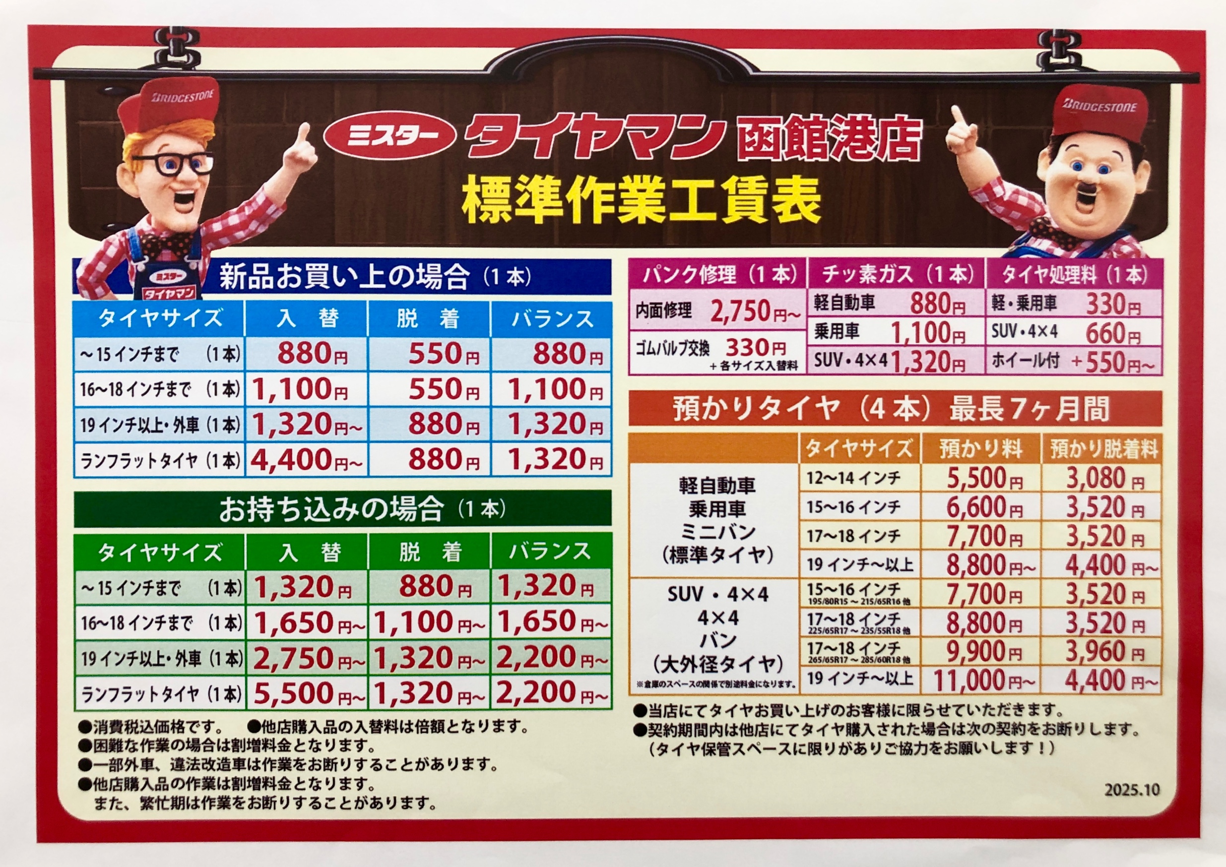 いつもミスタータイヤマン函館港店をご利用頂きありがとうございます。 作業工賃改定のお知らせです。 昨今の物価高騰に伴い、現行のサービスを維持するために、2025年10月1日より作業工賃を一部改定させて頂くこととなりました。 大変心苦しいところでございますが、今後もより良いサービスの提供...