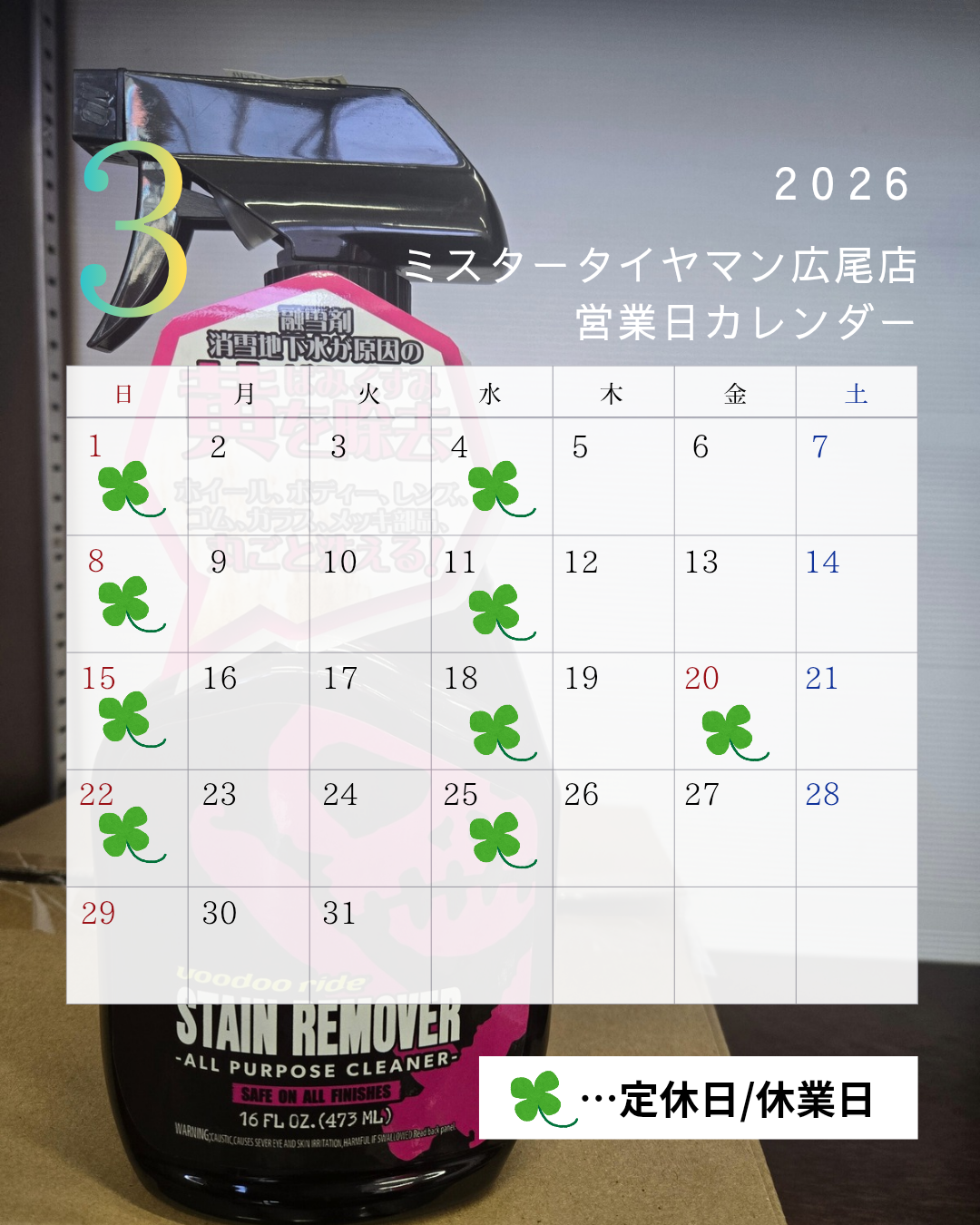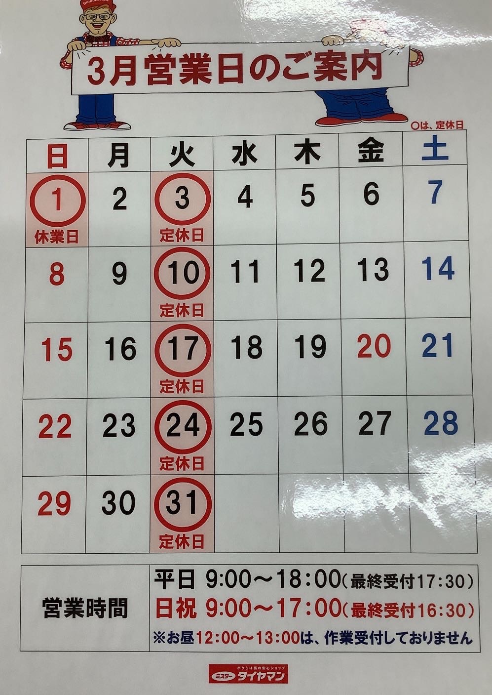 いつもミスタータイヤマン広尾店を ご利用いただきありがとうございます! 3月の営業カレンダーです ご来店・ご予約の参考に なさって下さい!! 定休日:水曜日 日曜休業:3/1・3/8・3/15・3/22 祝祭日休業:3/20 ◆第五日曜の3/29は営業いたします!!