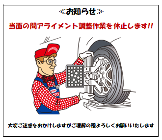 いつもミスタータイヤマン広尾店を ご利用いただきありがとうございます! 皆様にお知らせです 機材の不具合により 当面の間、アライメント調整作業を 休止する事となりました 大変ご迷惑をおかけしますが ご理解の程よろしくお願いいたします m(__)m