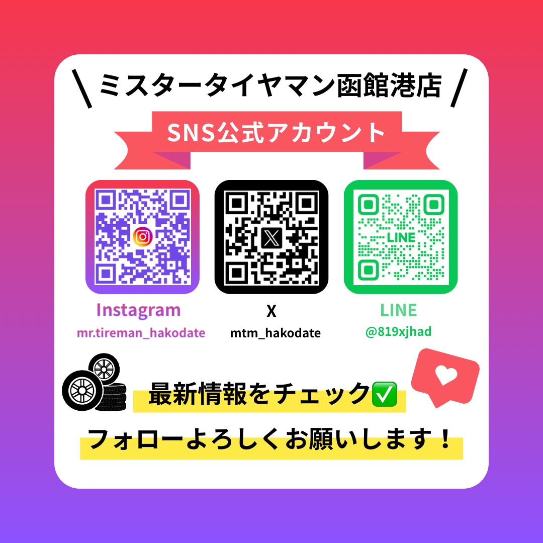 いつもミスタータイヤマン函館港店をご愛顧頂きありがとうございます! お知らせでご紹介できておりませんでしたが、当店の公式SNSがあるのをご存知でしょうか? 当HPやGoogle、Yahooなどのページは、お客様が検索をして頂いた時に常に最新の情報をキャッチできるように、こまめに更新しています! ...
