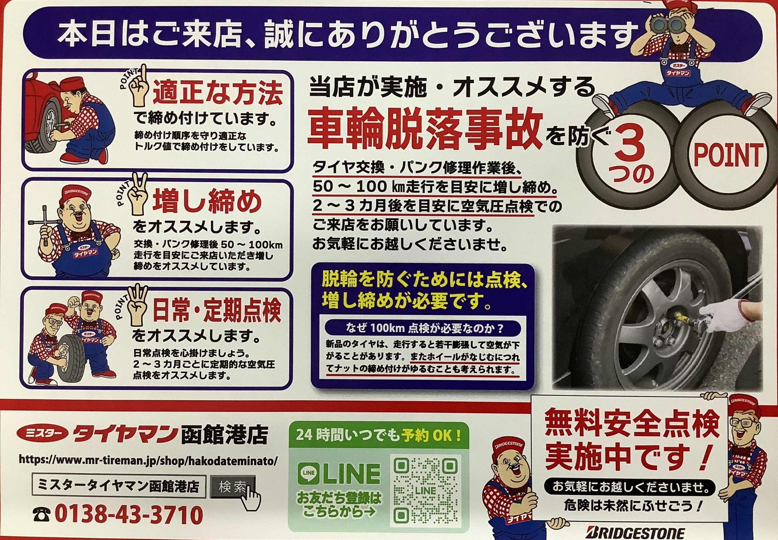 いつもミスタータイヤマン函館港店をご愛顧頂きありがとうございます。 1月・2月は、無料安全点検、ナット増し締め、空気圧調整の強化月間!皆様、スタッドレスタイヤへ交換後の点検はお済みですか?昨今、タイヤの脱輪事故のニュースを目にすることも多いですよね。タイヤ交換後、50〜100km走行を...