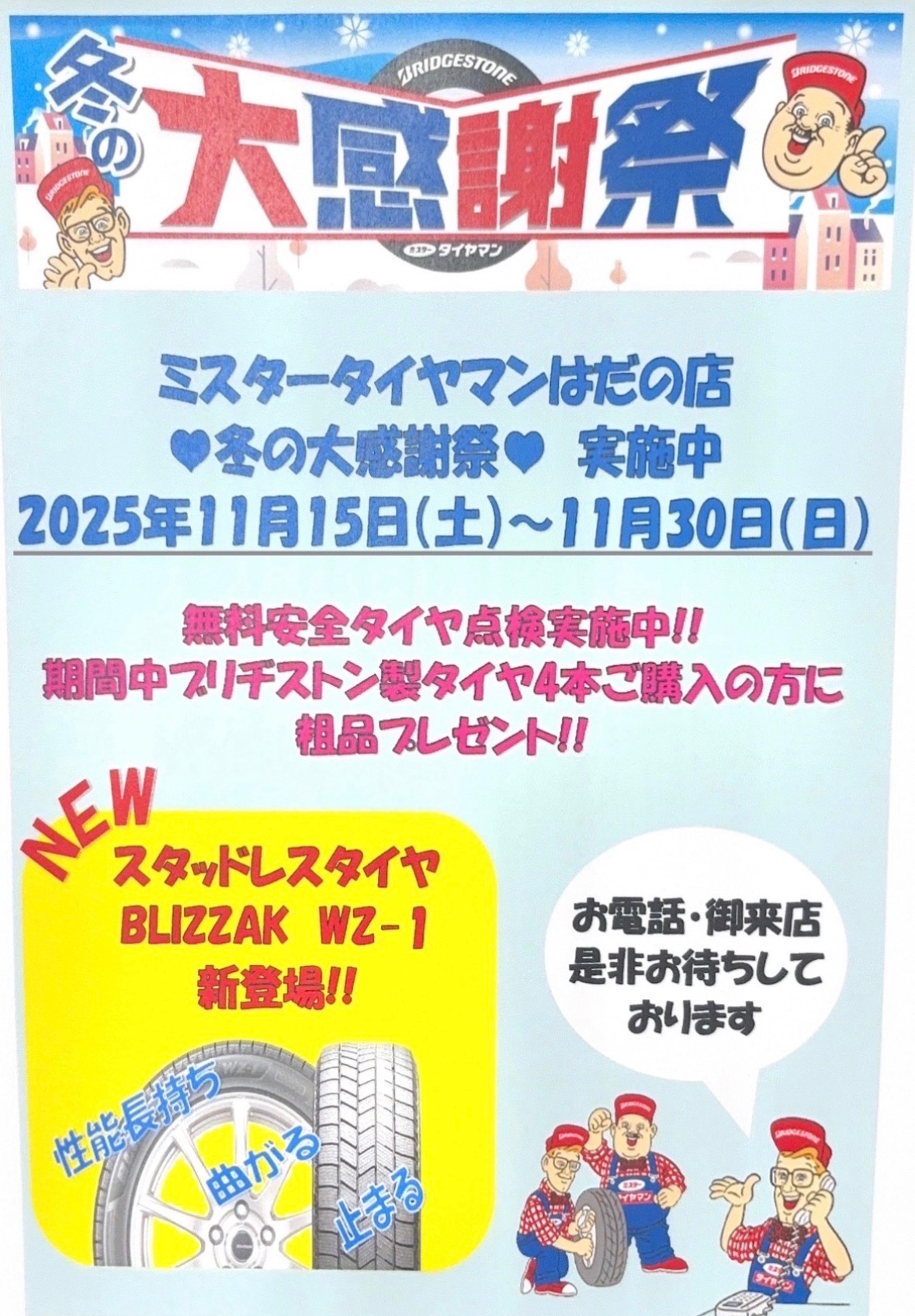 こんにちは(´˘`*) ミスタータイヤマンはだの店 冬の大感謝祭もあと5日間です⟡.* スタッドレスタイヤのお見積もりなども 是非御来店お待ちしております♡ ミスタータイヤマンはだの店 TEL0463-84-7100