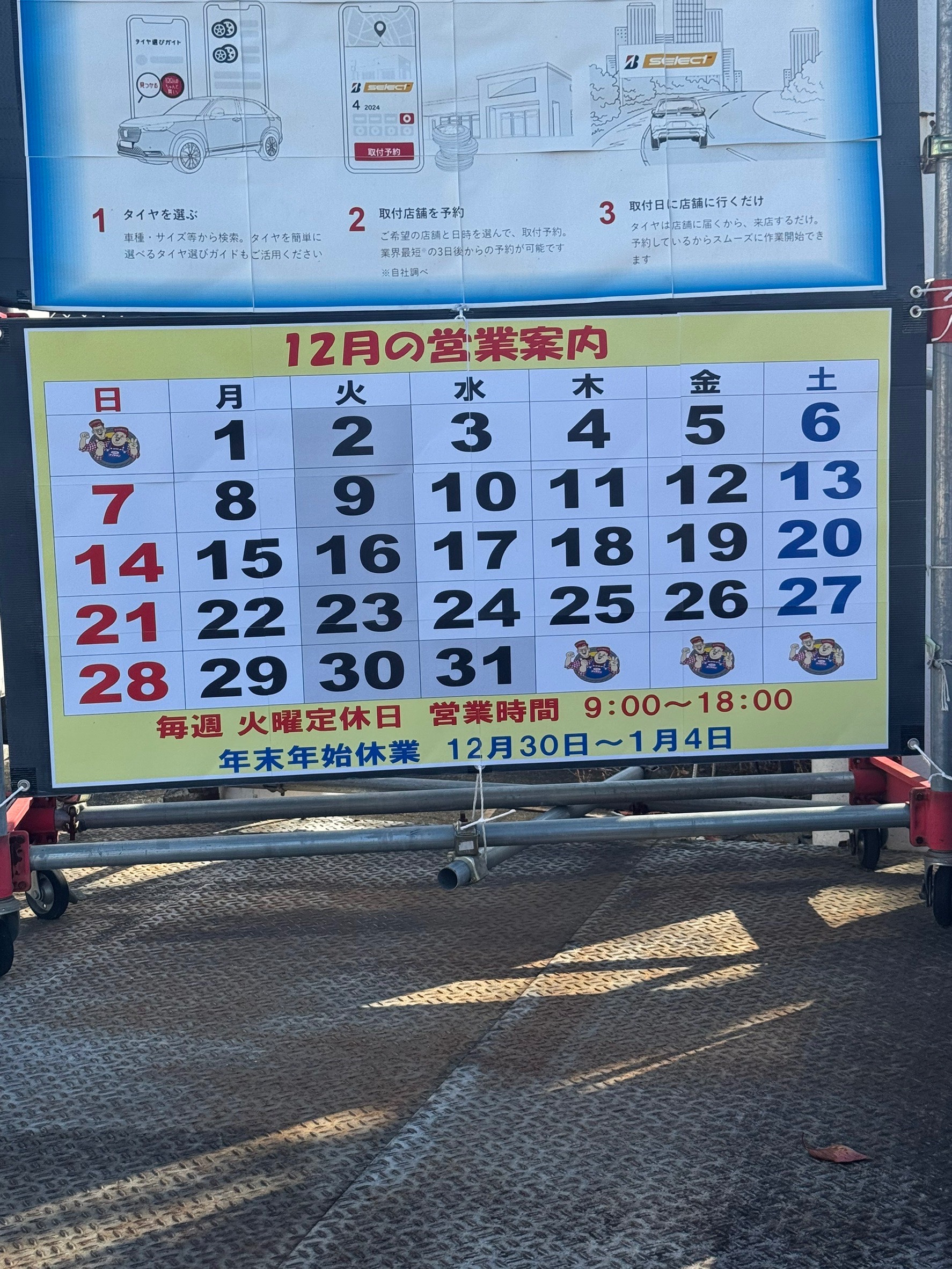 こんにちは(´˘`*) 12月も宜しくお願い致します!! 12月の定休日は 毎週火曜日となります! 年末年始の営業のご案内です。 12月30(火)~1月4日(日)まで 誠に勝手ながら年末年始休業と させていただきますm(_ _)m 皆様のご来店をお待ちしております(*◕ᴗ◕*) ミスタータイヤマンはだの店 TEL04...