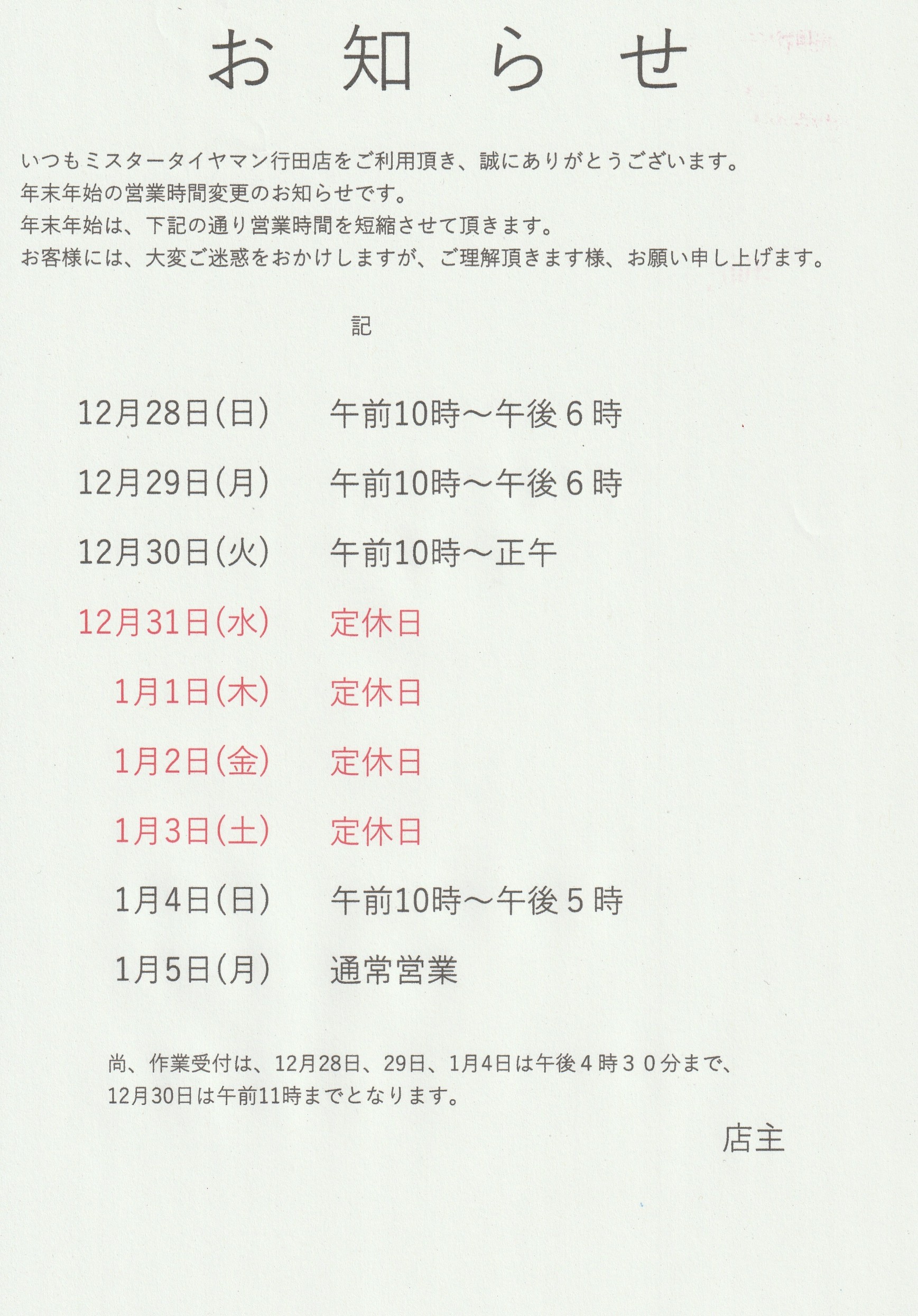 年末年始休業のお知らせ & 12/29(月) 営業時間について