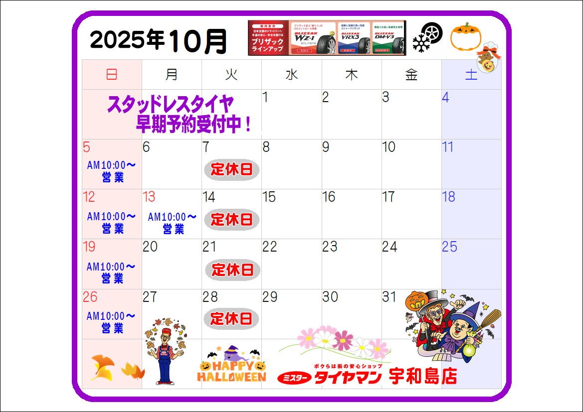 長かった夏の暑さも終盤~秋の風がふくようになりました♪ 季節の変わり目、体調にお気をつけください。 ◎10月営業カレンダー ◎秋の行楽シーズン! 「お出かけ前にはタイヤ点検を」 ◎スタッドレスタイヤ 引き続き「早期予約受付中!」 ❆冬タイヤご検討の方はお早めに。 ❆お見積無料 ・・・・・・・・...