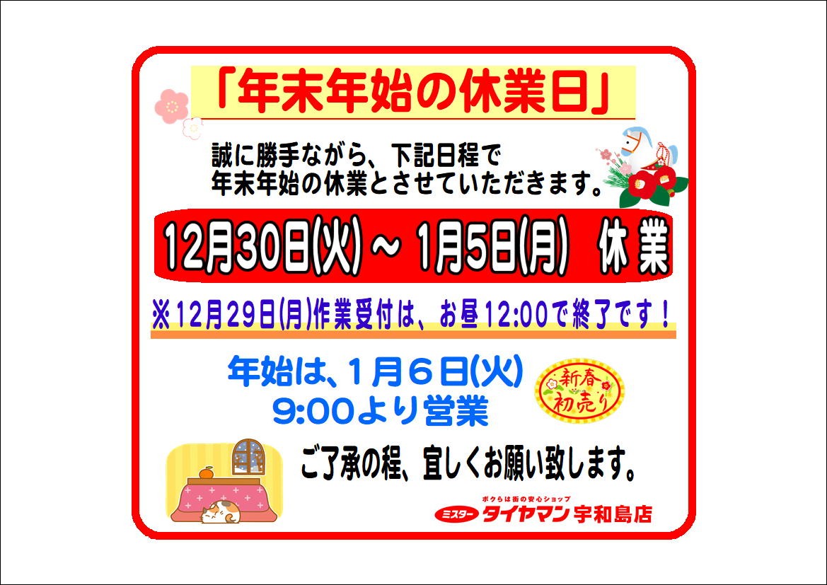 こんにちは〜 今年もミスタータイヤマン八幡浜店をご利用頂きありがとうございました٩(^‿^)۶ 年明けは1月6日(火)からの営業になります。 2026年もどうぞよろしくお願いします(o^^o)