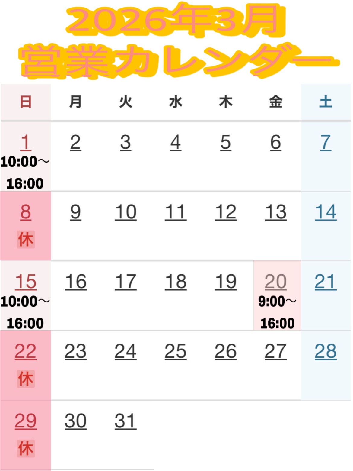 2026年3月 営業カレンダー