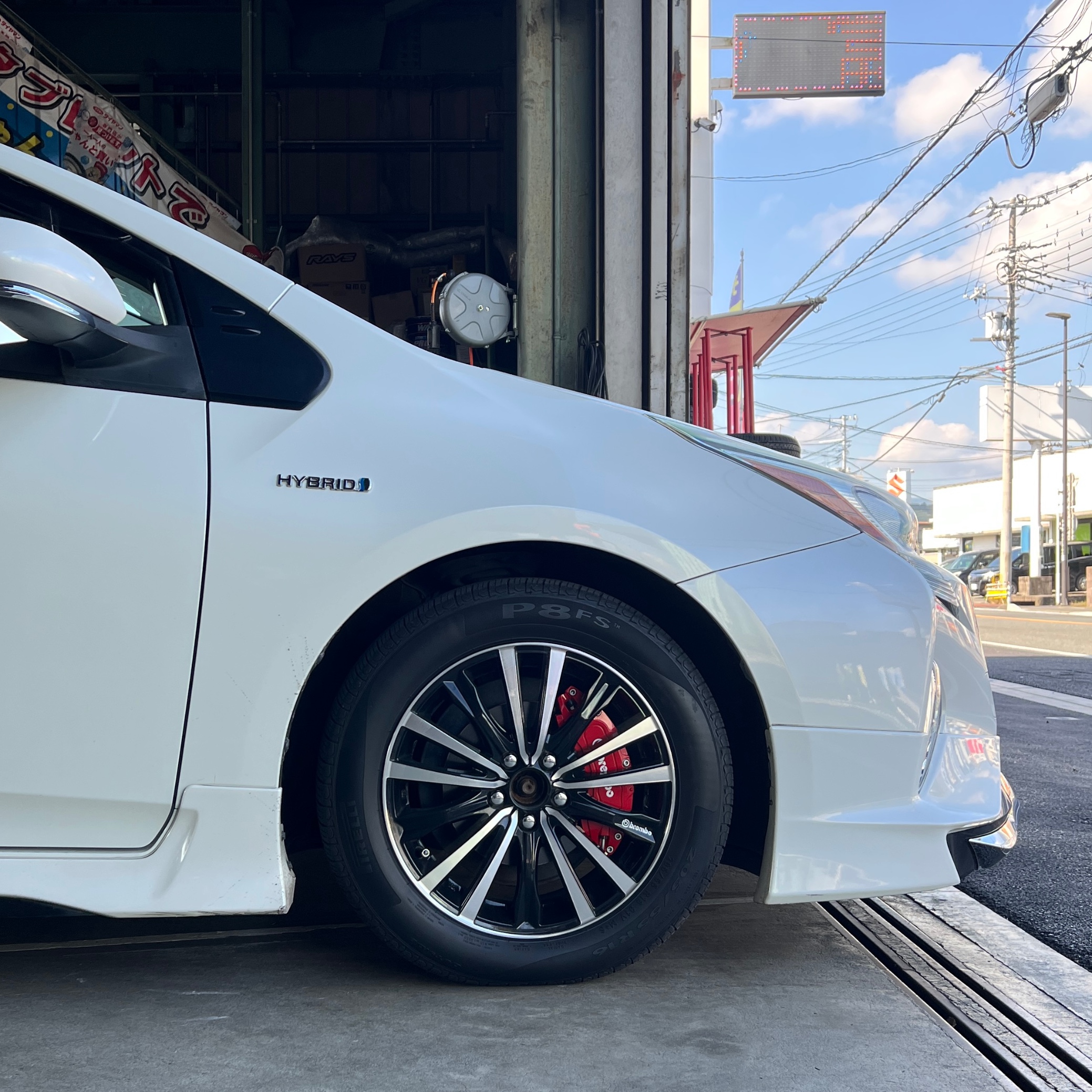 元々はただの赤いキャリパーカバーだったんですが、取り付け前にお客様が某ブレーキメーカーの白いステッカーを貼り、より一層カッコ良さが増しました(*^^)v