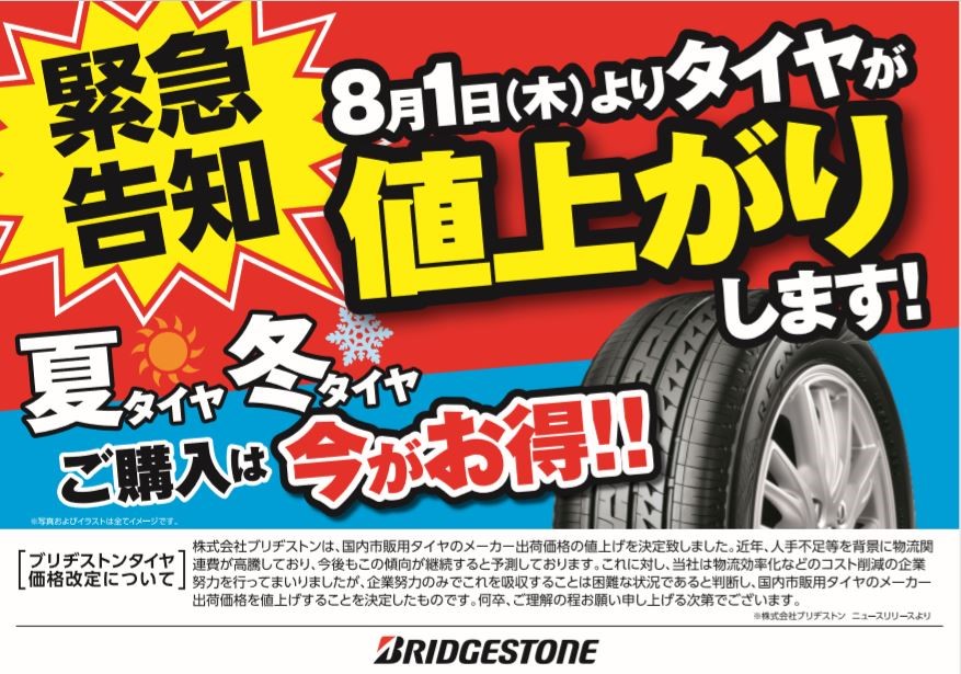 8月1日より(株)ブリヂストンの値上げも発表されております。