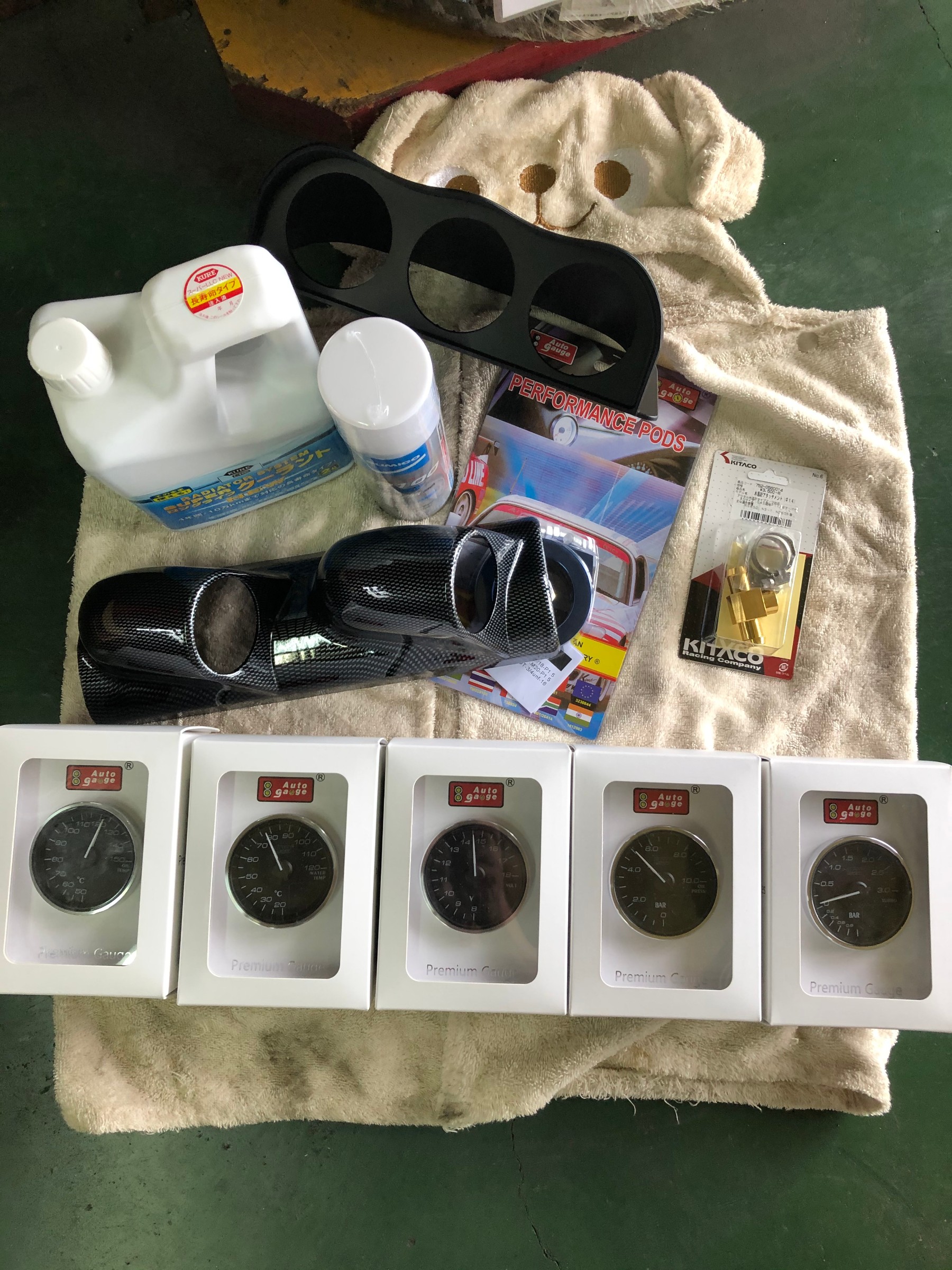 ダッシュボード上に3連とピラーに2連。それぞれ汎用のメーターフードを