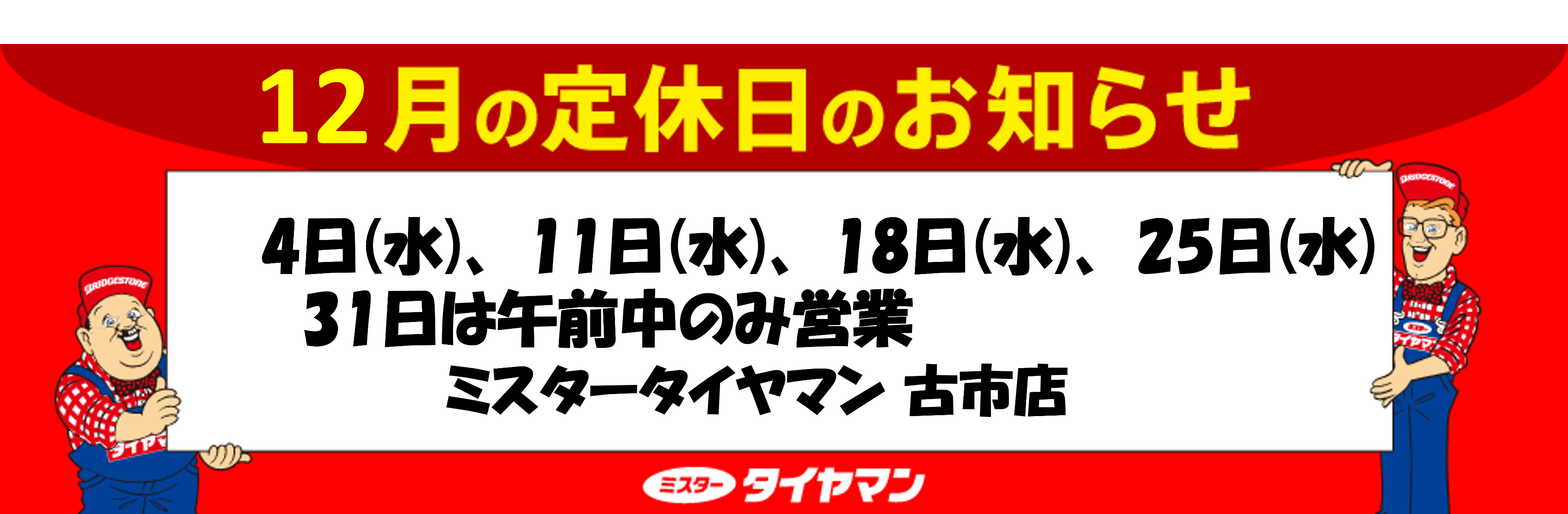 2024年12月の定休日のお知らせ(^^♪ 2024年11月25日 当店HPをご覧いただきありがとうございます(^^)/ 2024年12月の定休日のお知らせです(^^♪ 通常通り、毎週水曜日が定休日となります<m(__)m> 31日(大晦日)は、午前中の予約作業のみとなります。 営業時間は、AM9:30~PM7:00 作業の最終受付時刻はPM6:30となります。