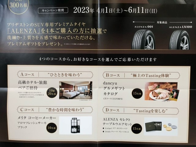 ALENZAのタイヤ4本ご購入の方に抽選で当たるプレミアムギフトとなっております!