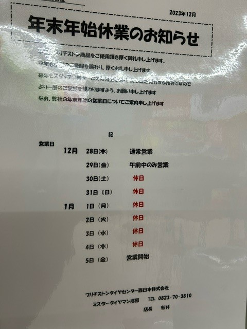 年末年始の営業日のお知らせです。