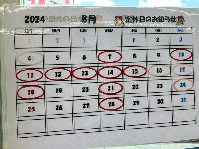 いつも通り赤丸がお休みとなっておりますが今月はお盆休みなどがありますのでお越しになる際はお気をつけて来店、よろしくお願いいたします。