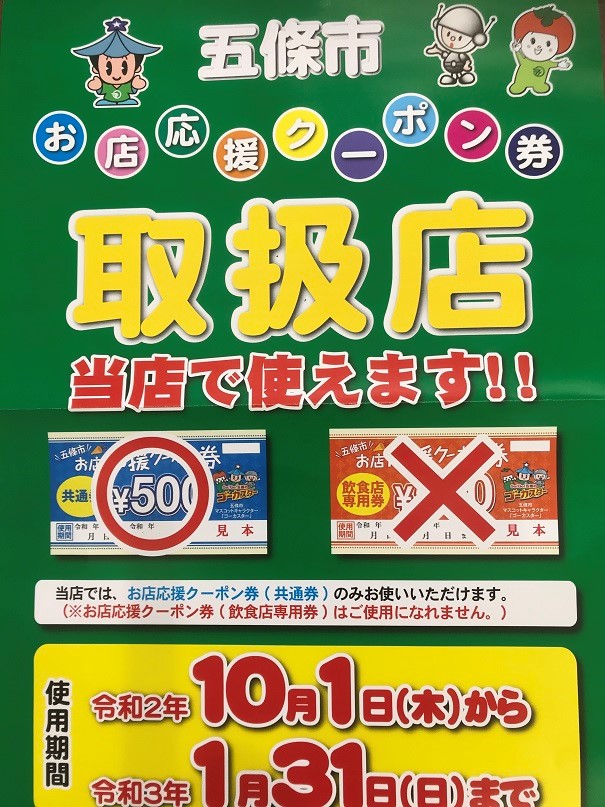 五條市 お店応援クーポン券(共通券)、当店で使えます。(※お店応援クーポン券(飲食店用)はご使用できません。)