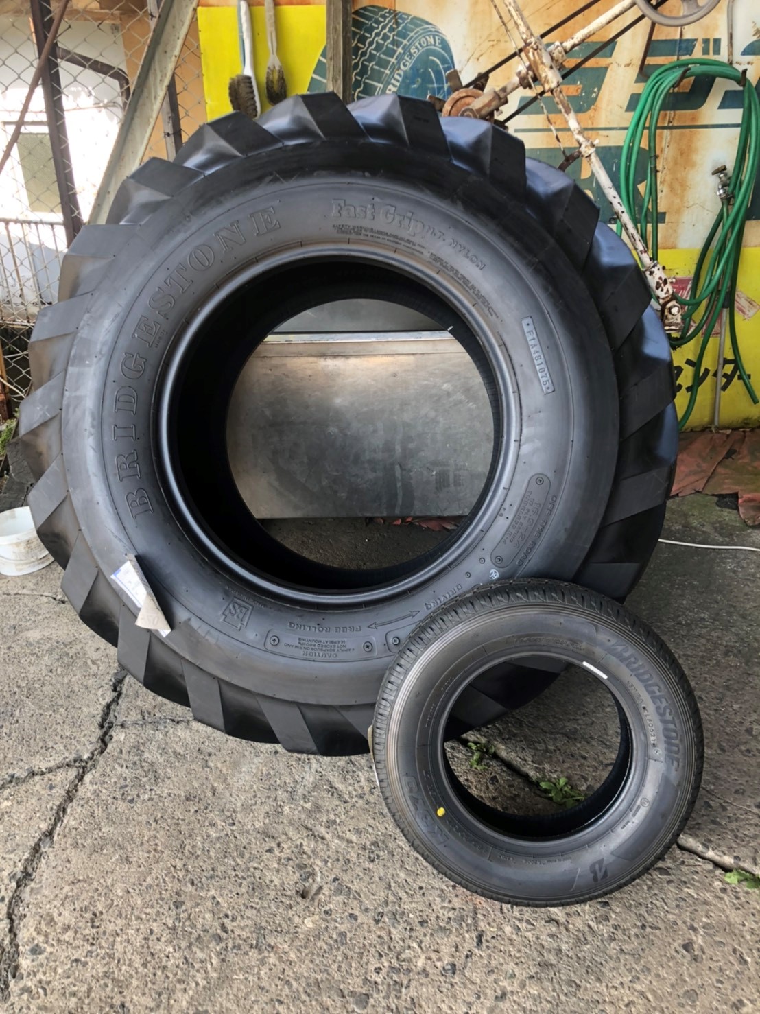 今日は大きなタイヤの交換作業がありました。軽トラのタイヤと比べると、とんでもなく大きいですね。