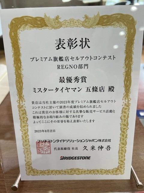 この度ブリヂストンタイヤから、プレミアム旗艦店セルアウトコンテスト「REGNO」部門で最優秀賞の表彰を受けました。