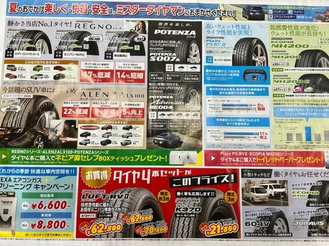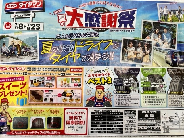夏の大感謝祭!! 2023年7月9日 当店ではただいま夏の感謝祭を開催中です!(7月23日まで) この機会に是非お立ち寄りください。 タイヤ4本お買い上げの方には、ガチャポンで美味しいスイーツが外れくじなしで当たります! 高級ティッシュペーパーやトイレットペーパーもプレゼント中です!