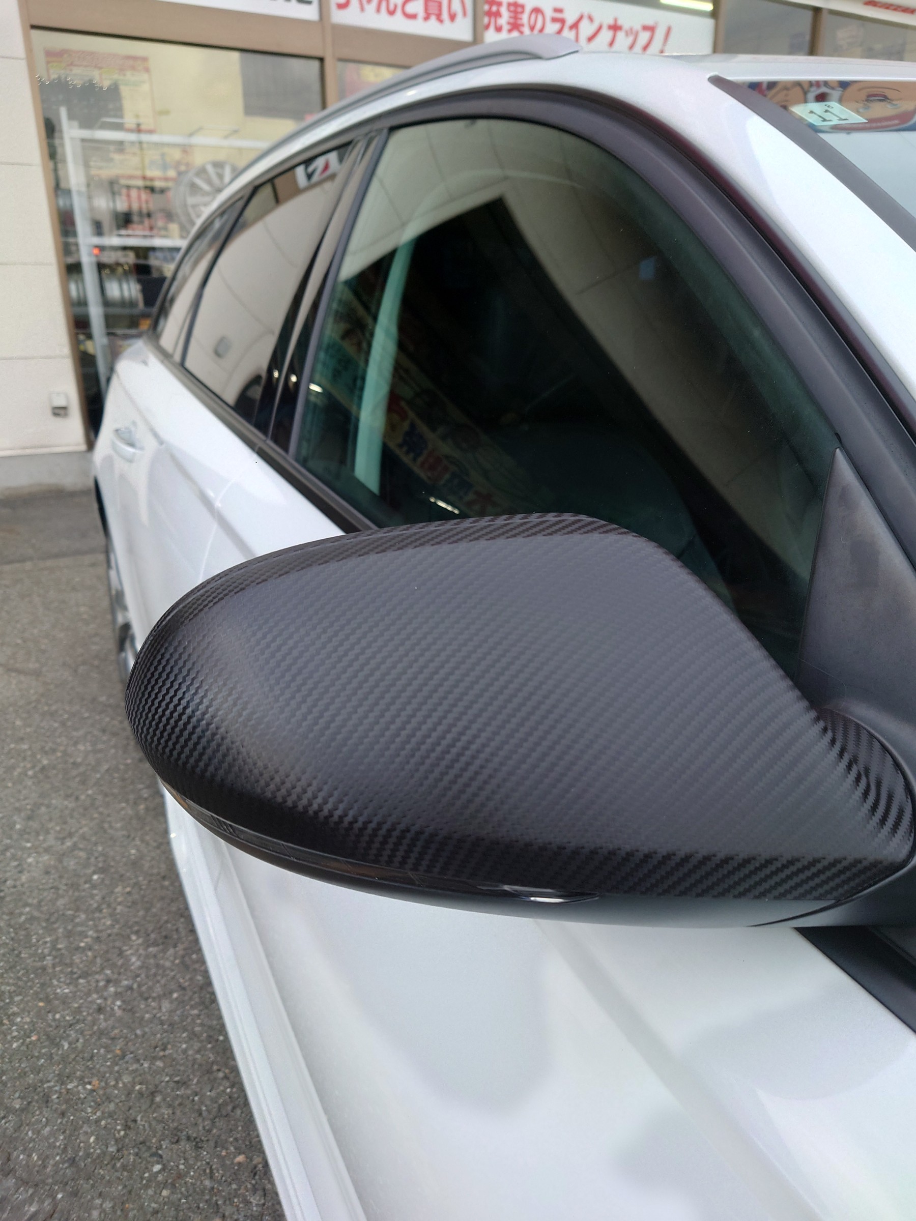 ミラーカバー上部にカーボン調フィルム、土台部分にはマットブラックフィルムを組み合わせたツートーン仕上げ。