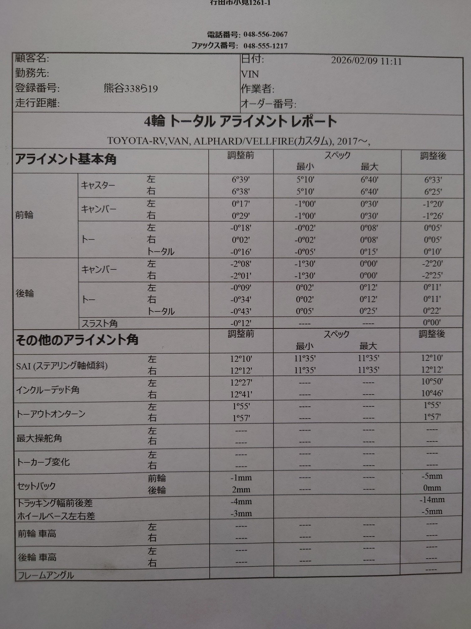 2026年2月11日トヨタ アルファード その他 その外サービス > アライメント調整