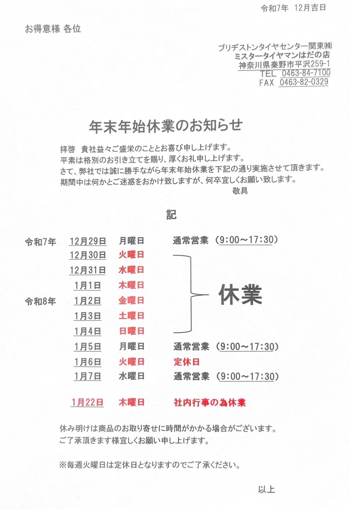 年末年始休業のお知らせです!!