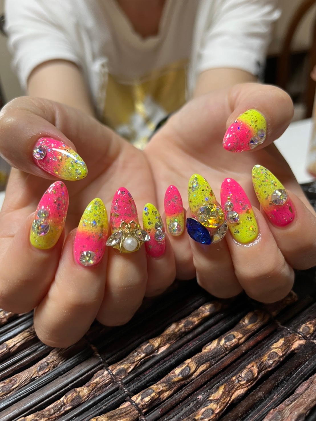 ꫛꫀꪝ♡ 2022年7月5日 こんにちは(*^^*) 台風が近づいてきてるからか… 雨が酷いです。。 そしてお昼ご飯の後は… 眠いです\(ᯅ̈ )/ さて♡本日は……… 毎月恒例の…… ネイルで〜す\( ¨̮ )/ はい♡夏きました♡♡♡♡ 派手大好きです♡ さりげなく蜂乗ってます♡ 今回も自己満足ですね♡ 皆さん、暑さに負けず 頑張りましょう«٩(*´ ꒳ `*)۶»