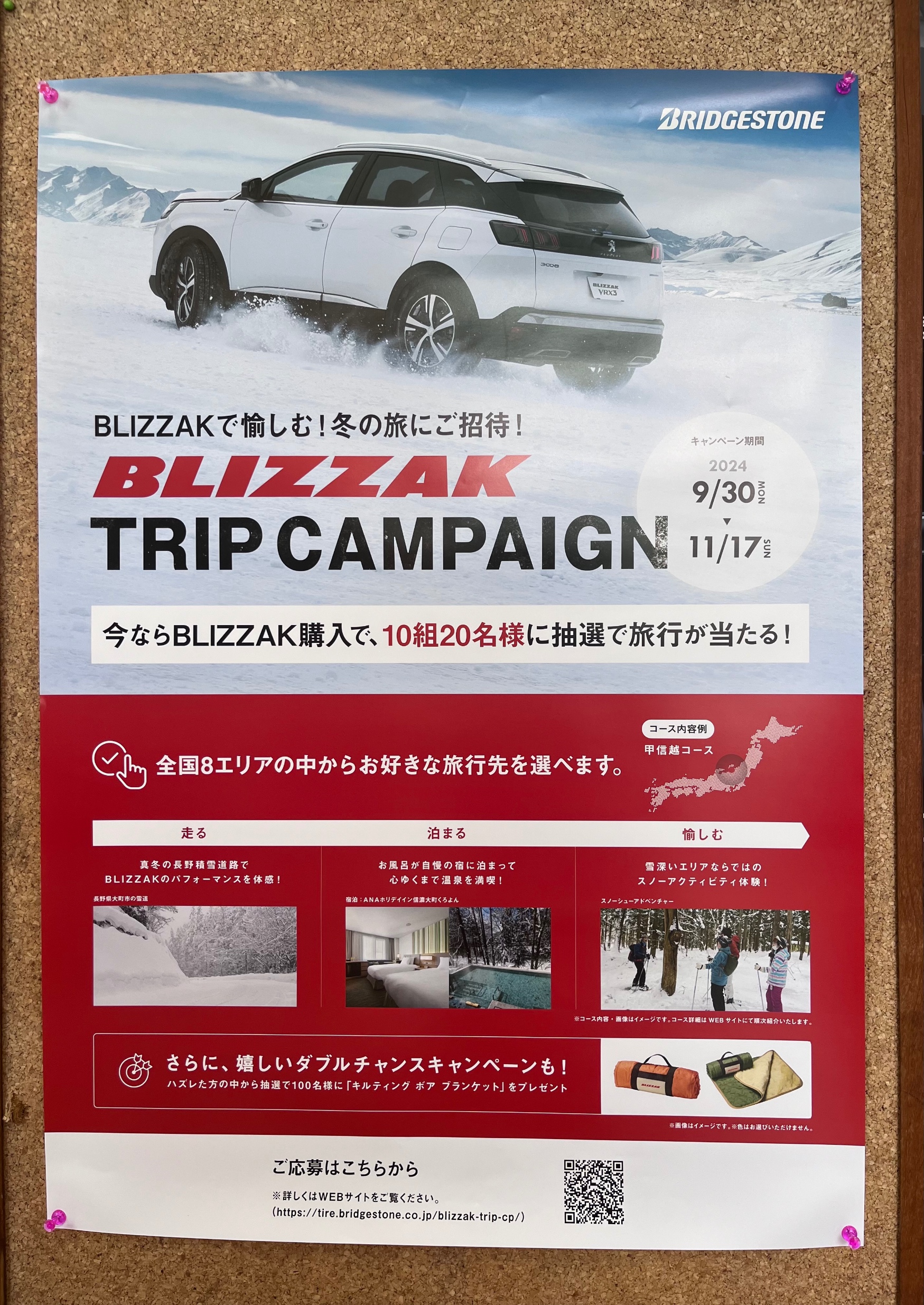 ♡BLIZZAK TRIP CAMPAIGN♡ 2024年10月3日 こんにちは(*´˘`*)♡ 10月になり少しずつ気温が下がってきましたね!! スタッドレスタイヤのキャンペーンの お知らせです!! 2024年9月30日(月)~11月17日(日)の期間中 スタッドレスタイヤをご購入の方を対象に 10組20名様に抽選で旅行が当たります!! 今シーズンも寒冬になりそうです!! 当店では早期スタッドレスタイヤの ご予約・ご購入をお受けしております。 是非お見積もり・ご相談に御来店くださいませ♡