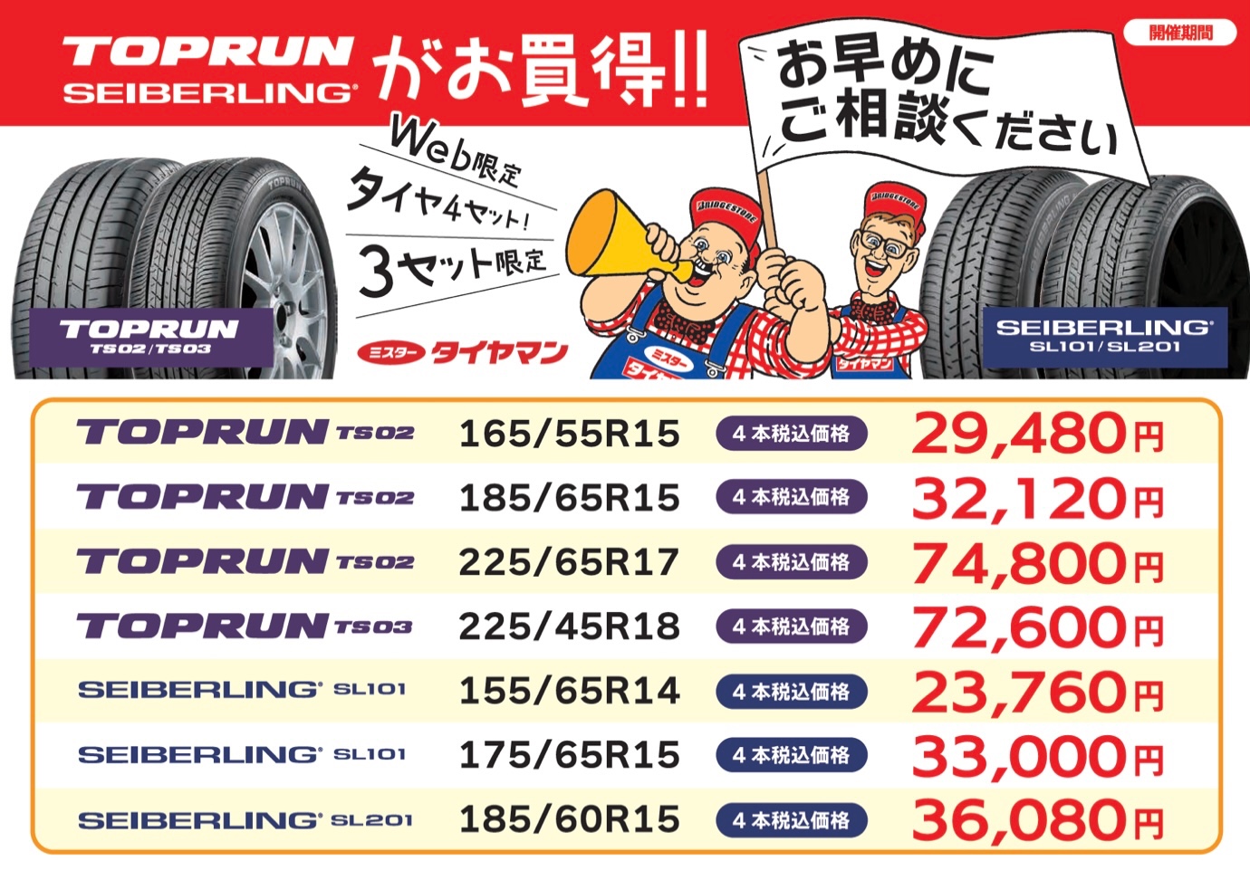 WEB限定!お買い得タイヤあります! 2026年4月11日 WEB限定お買い得タイヤ! いつも当店をご利用頂きありがとうございます 春の大感謝祭期間中、当店WEB限定で お買い得タイヤをご用意! ブリヂストン工場製の夏タイヤ 『トップラン』と『セイバーリング』がお買い得 ◎期間:4/11(土)〜4/20(月) ◎限定3セット ◎作業工賃、廃タイヤ料金は別途 お求めのお客様はWEBを見たとスタッフにお知らせください!