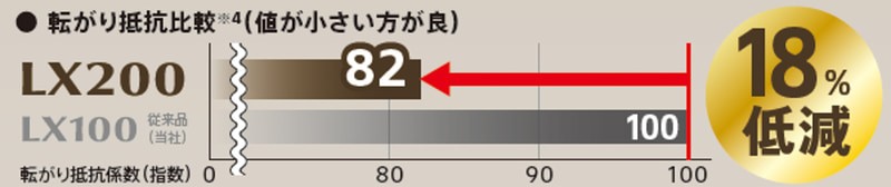 タイヤの軽量化、新しいゴムの採用、最適接地形状の実現により、転がり抵抗を前モデルより18%低減したことで低燃費性能を向上しました。また省資源化に加えて、再生資源や再生可能資源を原材料の一部に用いることで地球環境の負荷低減に貢献しています。