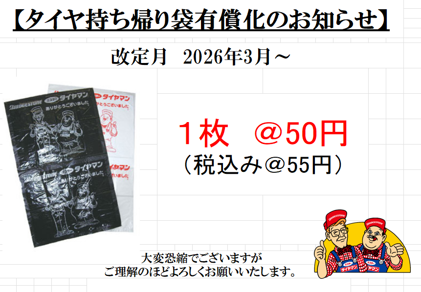 3月よりタイヤ持ち帰り袋有償化のお知らせ