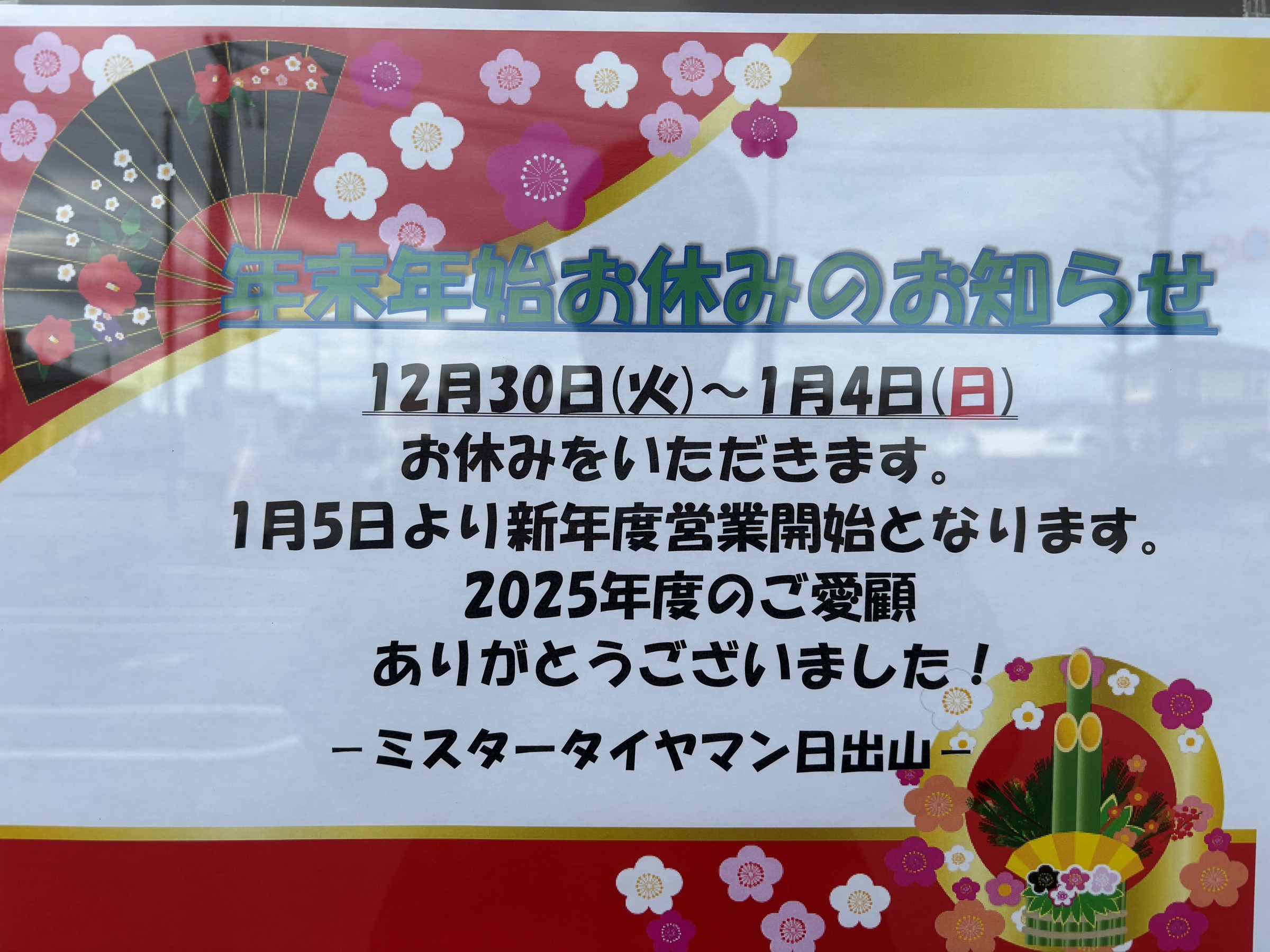 -年末年始休業のお知らせ- 2025年12月20日 日出山店の2025年最終営業日は12/29(月)となっております。 12/30(火)から1/4(日)まで年末年始休業とさせていただきます。 新年度スタートは1/5(月)となります。 2025年も日出山店のご利用ありがとうございました(●´ω`●) \よいお年をお迎えください/