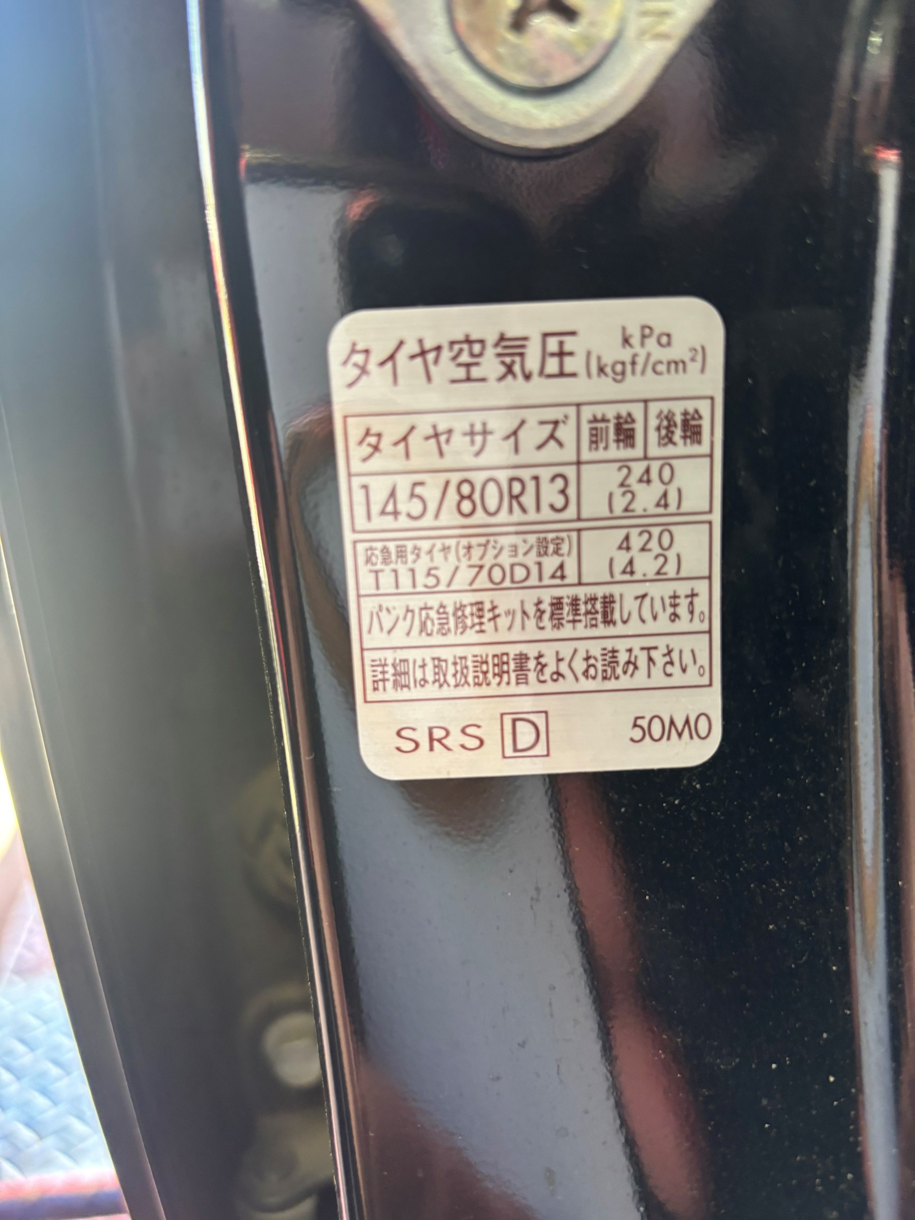 指定空気圧は国産車の場合運転席のドアを開けたところに