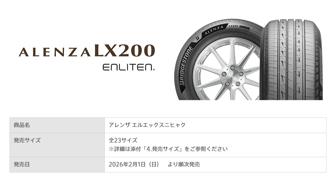 SUV向けプレミアムタイヤ「ALENZA LX200(アレンザ エルエックスニヒャク)」を2026年2月より順次発売します。「ALENZA LX200」は、商品設計基盤技術「ENLITEN」による「究極のカスタマイズ」で、プレミアムSUにふさわしい快適性能と運動性能、環境性能を両立し、上質なドライビング体験を提供する「断トツ商品」です