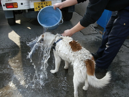 豪快にお湯を頭から掛けられてますが、懐いてます。尻尾ふってます。