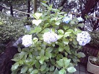 うちのアジサイが満開です。 今朝も玄関を出てすぐ、チビが