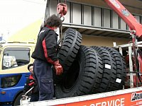 本日入荷の「ホイールローダー用タイヤ」です。 パンクノン(総ゴム)1200-24 ホイル付きで、1本350kgあります。