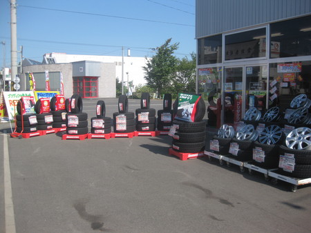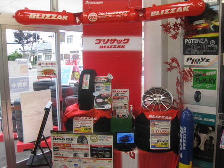 店内はもちろん店頭もブリザックスタッドレスタイヤが満載です