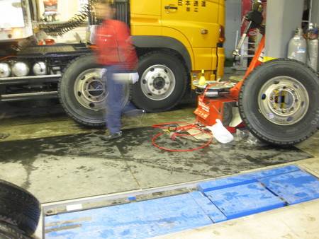 大型車両の履き替え作業はトラクターと呼ばれる牽引車はタイヤ6本+トレーラーと